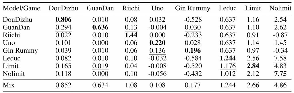 LLM能否同时掌握多种游戏?研究构建了混合所有游戏数据的训练集进行微调。结果表明,微调后的LLM在绝大多数游戏中显著优于GPT-4o等API模型及基座模型。特别是规则相似的游戏(如斗地主与掼蛋,或不同的德州扑克变体)之间存在正向的知识迁移(Positive Transfer),能够相互促进性能提升;而规则差异较大的游戏之间则可能存在干扰。
