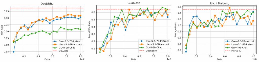 1)轨迹生成:利用现有的强博弈AI(如DouZero、DanZero、RLCard中的DQN模型)作为教师模型生成对局数据,对于立直麻将则使用人类专家数据。2)数据筛选与处理:为了确保数据质量,仅保留获胜玩家的观测-动作对,并过滤掉决策空间单一的简单样本,最终构建了包含超过800万条高质量训练数据的集合。3)指令数据生成:设计了针对每种游戏的Prompt模板,将游戏状态转化为文本指令,包括游戏规则、当前手牌、公共牌、历史动作及合法动作集,要求模型以JSON格式输出决策。
