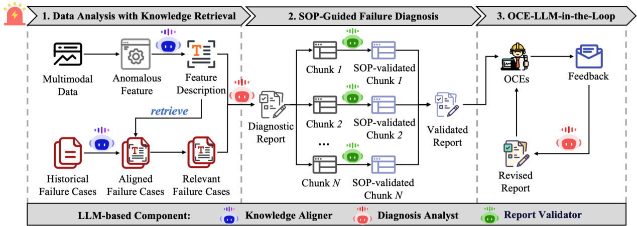 高效的故障诊断对保障生产环境中操作系统的稳定性与可靠性至关重要。然而,传统依赖人工分析的方式难以应对日益复杂的故障;同时,,而现有自动化方法常因可解释性不足而难以获得信任受限。大语言模型(LLM)虽展现出强大语义理解与生成能力,但现有方案往往难以融合领域知识且缺乏有效的工业级交互机制。