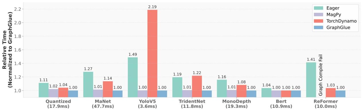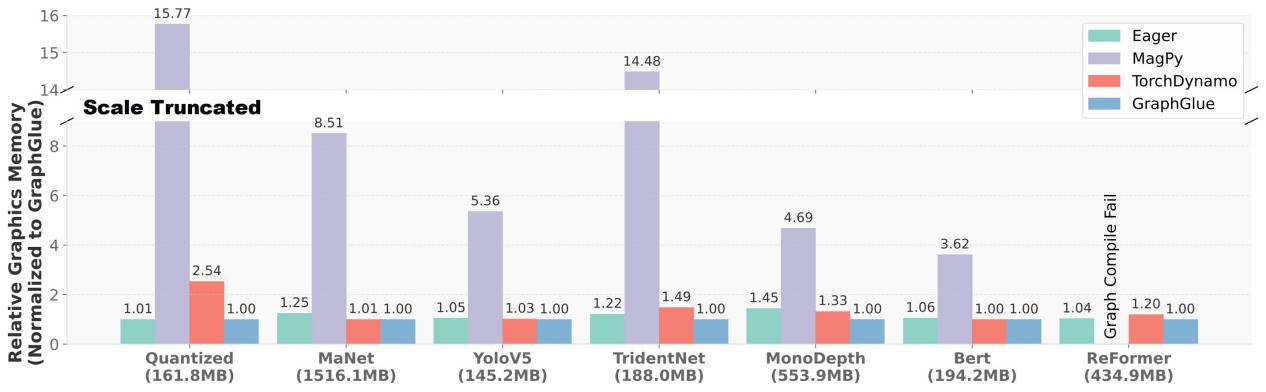 实验结果表明,GraphGlue相比TorchDynamo获得最高2.19倍加速(平均1.23倍),相比MagPy实现最高15.77倍(平均8.74倍)内存节省。