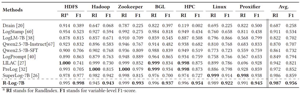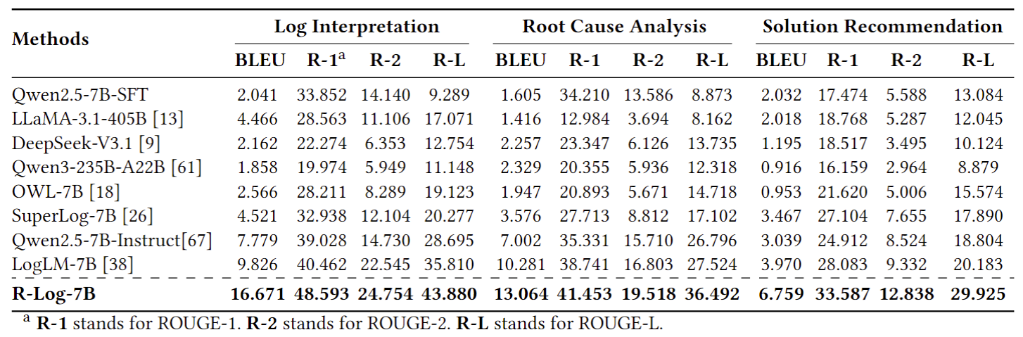 在五类日志分析任务(即日志解析、异常检测、日志解释、根因分析和解决方案推荐)方面,R-Log均显著超越现有最佳模型,包括 DeepSeek-V3.1、Qwen3-235B、LLaMA3 系列以及专业日志模型 LogLM 和 SuperLog,体现出在结构化推理和跨任务理解上的显著优势。