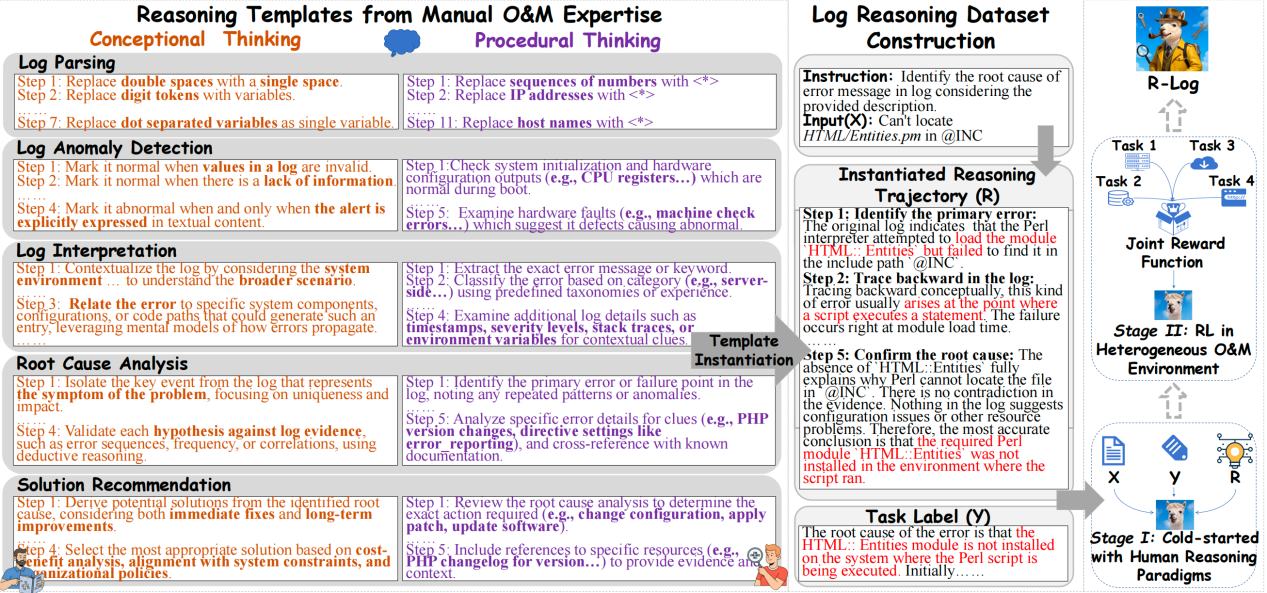 在人类专家推理模板与数据构建部分,R-Log从运维手册、经验规则与工程师访谈中总结出 13 套推理模板,覆盖五类日志分析任务,并包含概念式与程序式两类思维方式。利用这些模板,将真实日志与答案扩展为约 2600 条带推理链的训练样本,使模型能够从结构化、类专家的推理步骤中学习有效分析模式